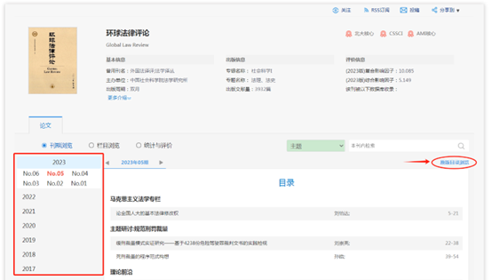 找到所需期刊并进入期刊导航页,左侧可以选择所需卷期,然后点击右侧“原版目录浏览”,即可获取期刊的高清封面、目录和封底等图片。