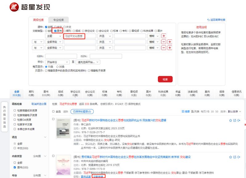 以习近平文化思想相关主题图书为例,利用超星发现进行检索,在检索结果中可以看到,部分图书在资源获取“途径”栏目下会提供“文献传递”的按钮。