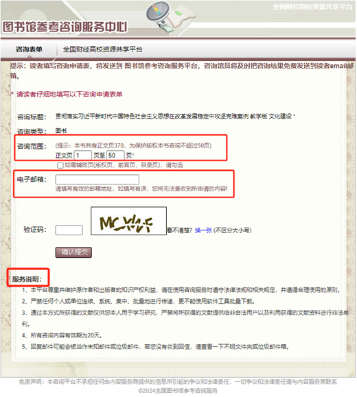 值得注意的是:1.在咨询时要注意咨询范围的相关提示,根据版权保护原则填写可咨询的页码范围;2.使用文献传递服务时要注意查看下方“服务说明”,注意咨询内容的有效期以及回复邮件情况,科学规范的利用资源和服务。
