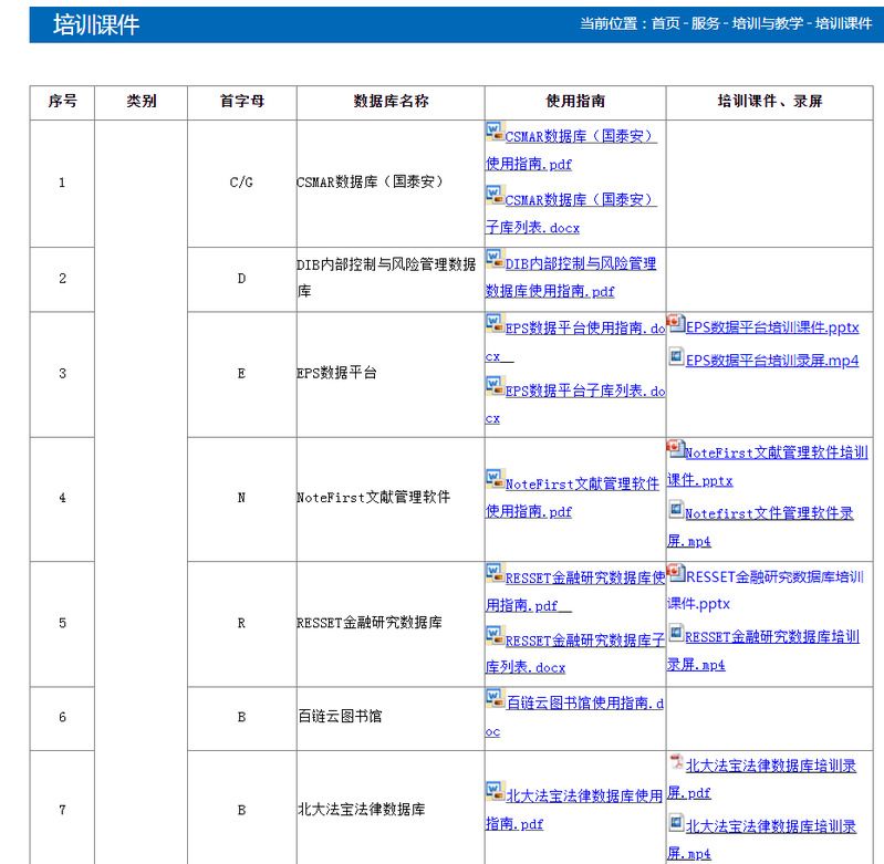 除此之外,在使用数据库中遇到疑问也可下载相关培训课件(或使用指南)进行学习,在图书馆主页,点击“服务”,选择“培训与教学”栏目,点击“培训课件”即可查看到所有数据库的培训课件(或使用指南),同学们可按需下载浏览。