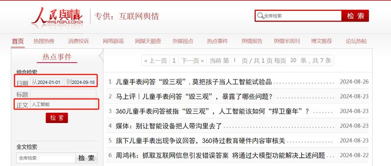 例如,想了解2024年以来有关“人工智能”的热点话题,可以在检索框中输入检索词“人工智能”,并进行时间限定,即可获取所需了解的相关热点。