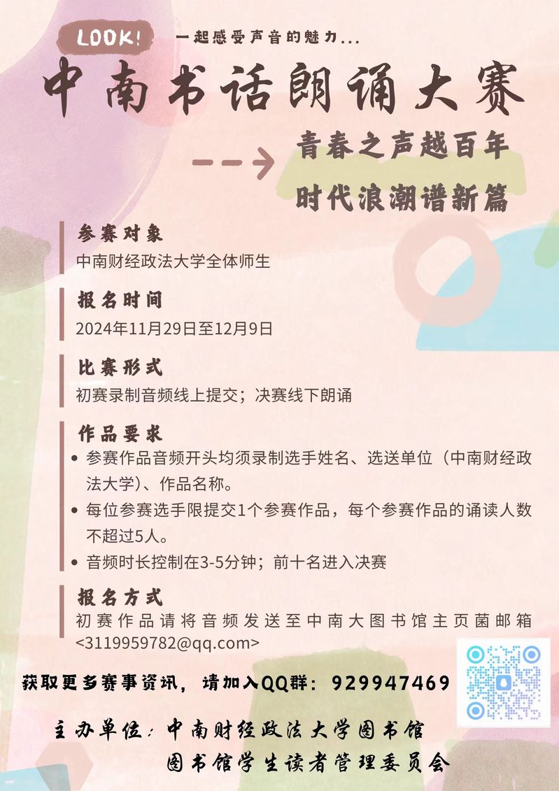 “书声琅琅满中南,文韵飘香映舞台”,为营造浓厚的文化氛围,激发大学生对阅读的热爱,米兰电竞·(中国区)图书馆联合图书馆学生读者管理委员会共同举办“中南书话”朗诵大赛,以朗诵形式展现文化魅力,以青年思想奏响新时代华章。具体事宜如下: