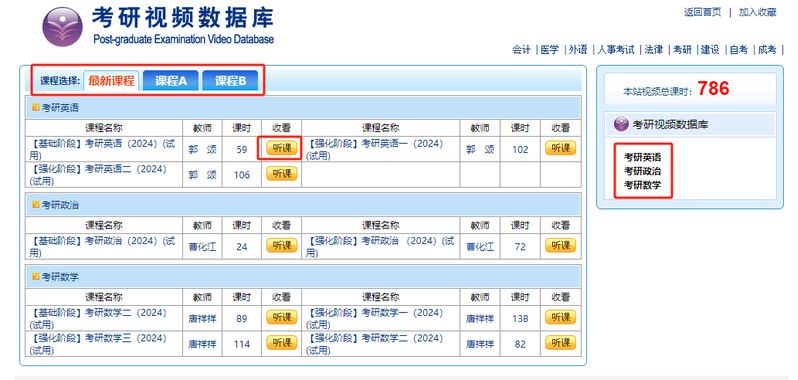 同学们可以选择对应的视频学习数据库,点击“听课”即可获取课程学习资料。