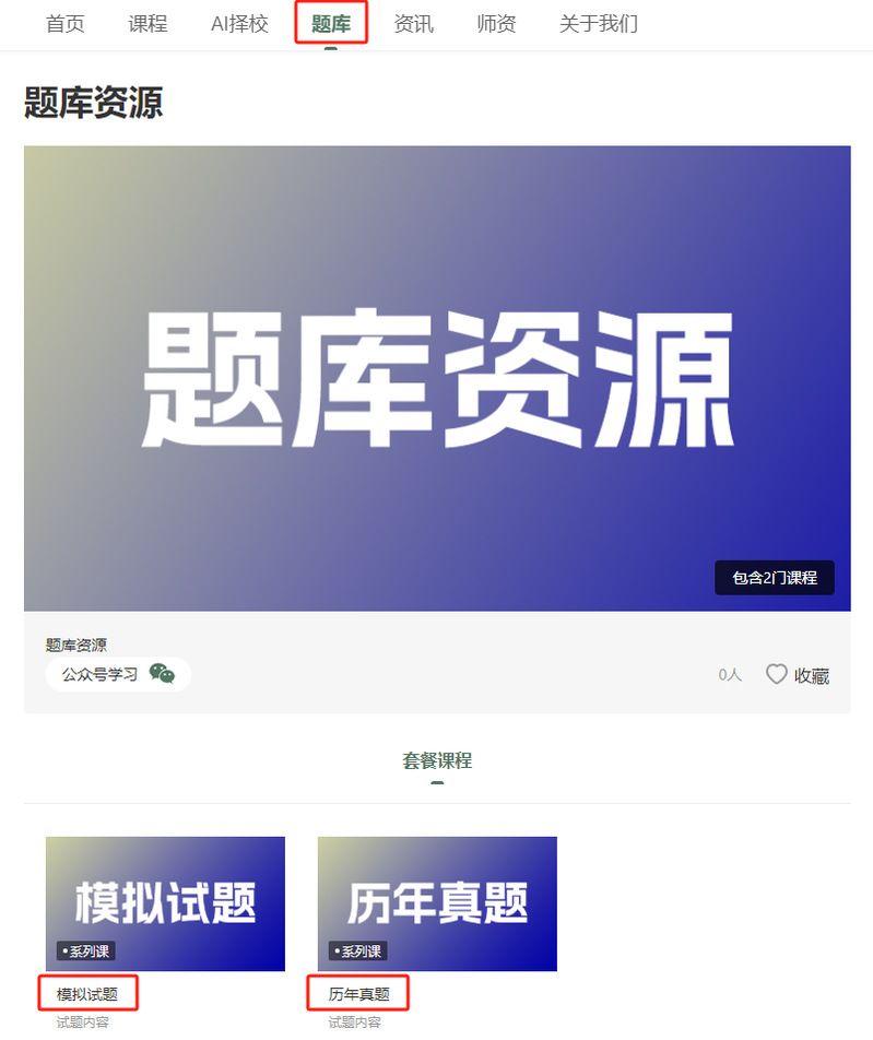 同学们可以直接进入“课程”模块,选择对应的课程即可进行学习。或者进入“题库”,选择“模拟试题”或者“历年真题”进行训练。