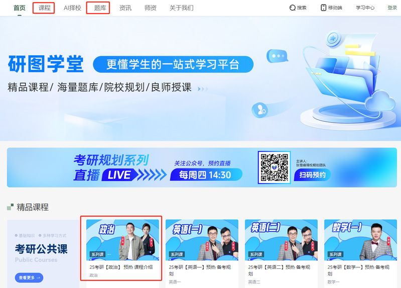 研图学堂学习平台目前由考研公共课、考研专业课、考研院校规划课程、英语四六级和教资五个课程部分组成,平台的课程和题库均有不定时更新,考研类课程可适用于当年的研究生考试。