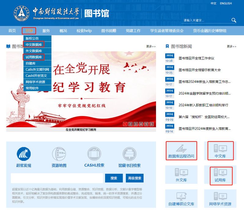 数据库访问方式:① 图书馆主页(https://library.zuel.edu.cn/)—资源—中文数据库/试用数据库;② 图书馆主页—中文库/试用库;③ 图书馆主页—数据库远程访问(非校园网环境请使用数据库远程访问)。