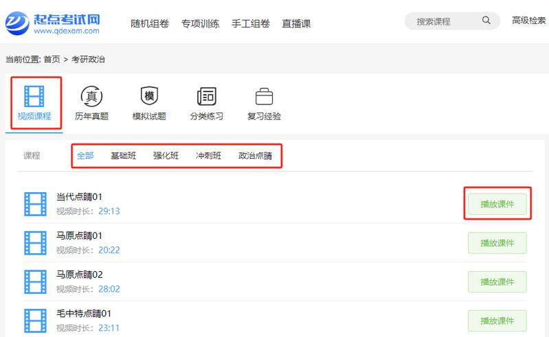 同学们可以根据自身的需求,选择“基础班”“强化班”“冲刺班”等视频教学资料,点击“播放课件”即可获得学习资源。