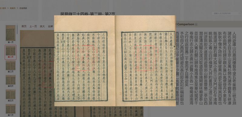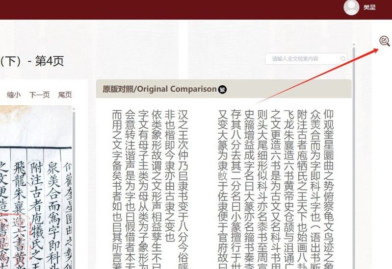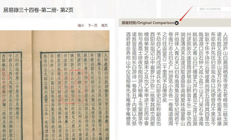 点击“放大”、“缩小”及“全屏”按钮对当前页进行缩放或全屏操作。点击“原版对照”旁边的繁简体切换按钮,可对文字识别结果进行繁简体切换。