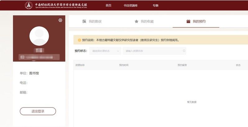 点击首页用户头像,进入“个人中心”,页面左侧显示个人信息,右侧为“我的勘误”“我的收藏”“我的预约”三个功能模块,点击“退出登录”可以退出当前账号。