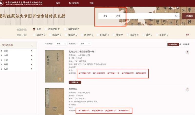 平台具备简单检索和高级检索功能,支持通过题名、全文、索书号、关键词、作者、出版年等检索字段进行检索,支持繁体简体字通检。例如,使用“全文”字段检索关键词“经济”,检索结果显示包含“经济”一词的文献和对应的准确页面链接,帮助读者快速定位感兴趣的内容。
