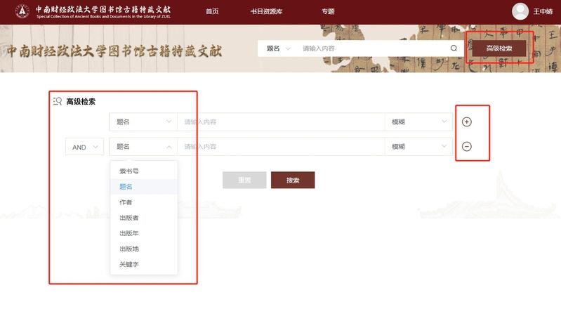 在“书目资源库”页面点击“高级检索”按钮进入高级检索页面。点击下拉框可以切换检索字段,高级检索支持多字段逻辑组合,读者可以添加多个检索条件,提高检准率。