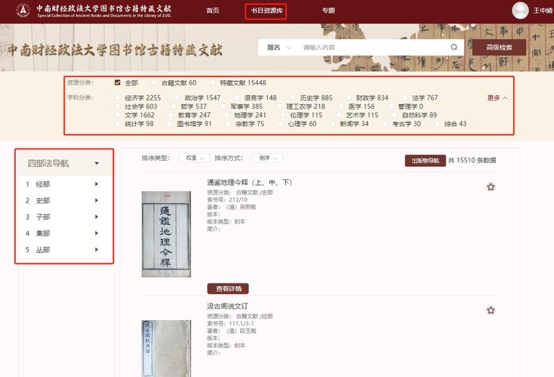 点击首页“书目资源库”或“查看更多”进入书目资源库页面,平台提供“学科分类”及“四部法导航”功能,读者可以在分类导航页面选择感兴趣的文献进行阅读。
