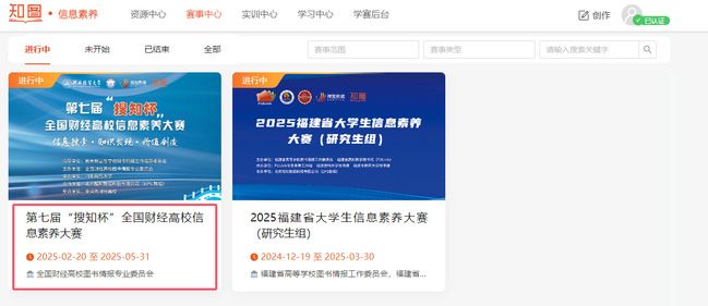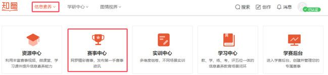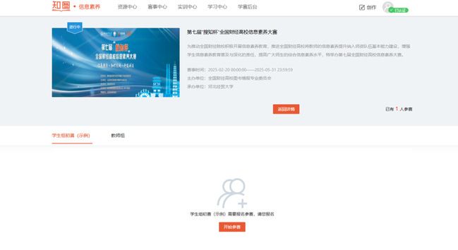 Step1:点击知图平台上方“信息素养”功能,在弹出的五个选项中点击“赛事中心”,点击赛事进入赛事页面,点击“进入赛事”按钮。