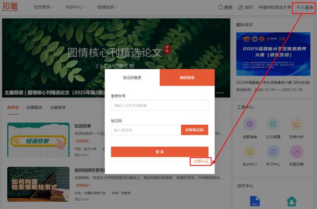 Step2:IP登录成功后,点击首页右上角“个人登录”,在弹窗中点击“立即认证”。