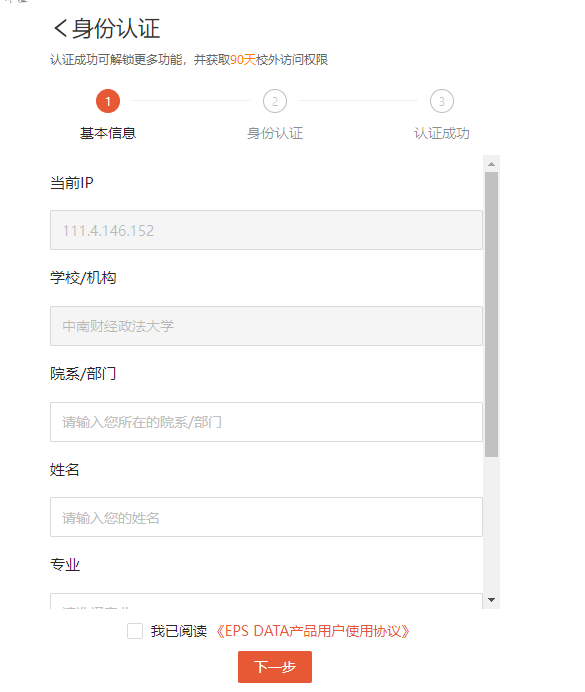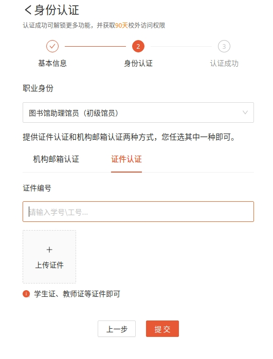 若账号未进行身份认证,步骤同上。点击首页右上角“用户头像——身份认证”,进入身份认证页面,查看学校机构是否匹配,如实填写职业身份、院系部门、专业后提交即可。