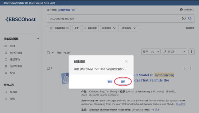 该功能需登录MyEBSCO 个人账户。单击“登录”按钮,使用已有账号或创建新账户登录。