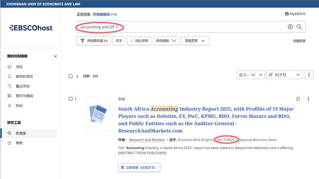 在EBSCO数据库(ASC&BSC)中,如果需要获取某个研究主题最近一周发表的文献,可在检索框中输入检索式:“DT 7 and 检索词”,或者“检索词 and DT 7”,即可将检索结果限定在一周以内,获取最新的研究成果。