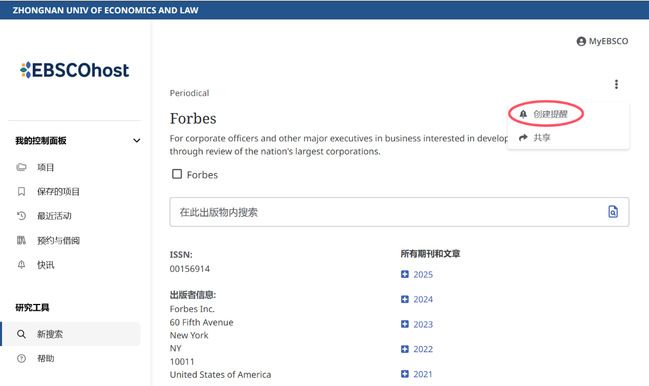 EBSCO数据库(ASC&BSC)支持用户创建快讯通知以节省研究时间。在检索结果界面选择“创建提醒”,当感兴趣主题有新的检索结果时,用户会收到电子邮件通知。