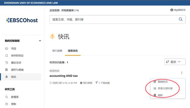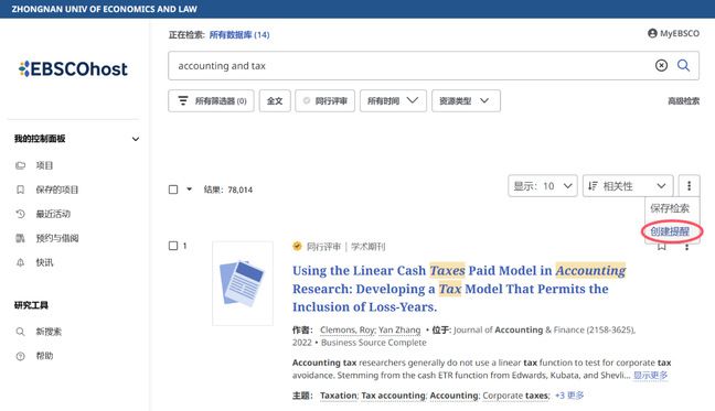 EBSCO数据库(ASC&BSC)支持用户创建快讯通知以节省研究时间。在检索结果界面选择“创建提醒”,当感兴趣主题有新的检索结果时,用户会收到电子邮件通知。