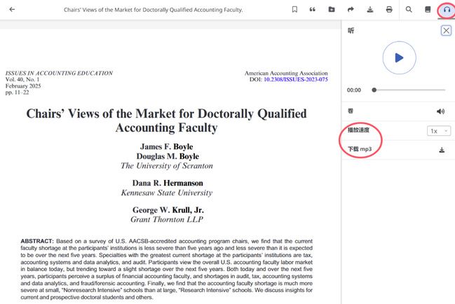 EBSCO数据库(ASC&BSC)支持全文朗读。在线阅读器页面中,点击右上角工具栏中的“耳机”图标,可以根据需求选择不同的语速,进行英文听读或跟读练习,也可以把朗读音频下载到本地离线使用。