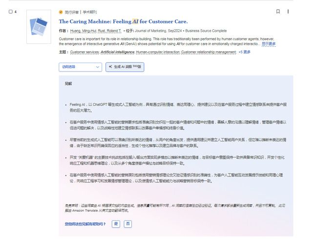 点击单篇文献右下方的“生成AI洞察Beta版”按钮,可按需获取有关文献要点的简短摘要。