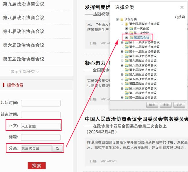如想了解全国政协十四届三次会议的代表发言和工作报告中涉及人工智能的内容,就可以在正文检索框中输入“人工智能”,并在分类框中选择对应的会议名称,即可检索到所需要的文献内容。