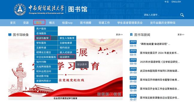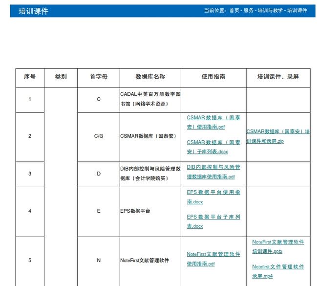 除此之外,在使用数据库中遇到疑问也可下载相关培训课件(或使用指南)进行学习,在图书馆主页,点击“服务”,选择“培训与教学”栏目,点击“培训课件”即可查看到所有数据库的培训课件(或使用指南),同学们可按需下载浏览。