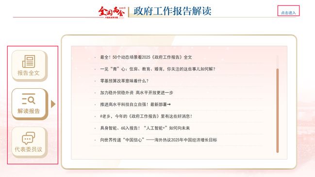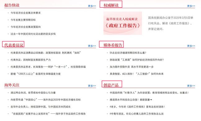 此外,全国两会专题网中提供了对政府工作报告的详细解读,既展示了政府工作报告的全文,又提供了官方权威解读、官方媒体报道、代表委员热议、创意产品等多样化的解读内容,供社会公众全方位、多样化地了解政府工作报告的内容。