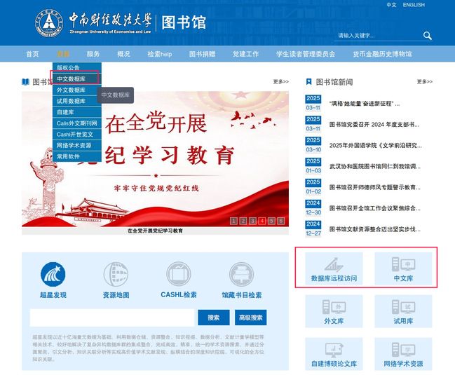 数据库访问方式:在校园网环境下,点击图书馆主页上方导航栏“资源”→“中文数据库”,或者点击图书馆主页右下方“中文库”;在非校园网环境下,点击图书馆主页右下方“数据库远程访问”后进行统一身份认证,就可以在中文数据库列表中按照数据库名称找到相应数据库。