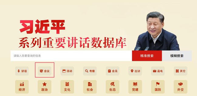 想要查找习近平总书记在全国两会上的讲话内容,可以在数据库首页中点击“会议”子库。