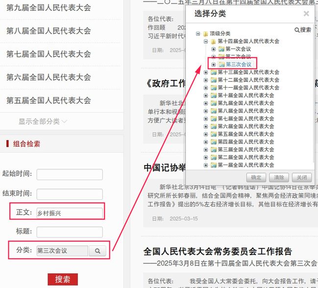 在高级检索界面,可以根据报道的发表时间、正文、标题等条件进行组合检索。如想检索第十四届全国人民代表大会第三次会议中与“乡村振兴”有关的新闻报道,可在正文检索框中输入“乡村振兴”,并在分类检索框中选择对应的会议名称,即可检索到相关内容。