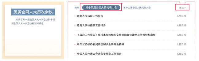 全国人大文献库中收录了历届全国人大历次会议的新闻报道,点击导航栏中的“第十四届全国人民代表大会”可以浏览最新的相关报道。如想要检索特定主题的新闻报道或官方文件,可点击右侧“更多”,进入高级检索界面。