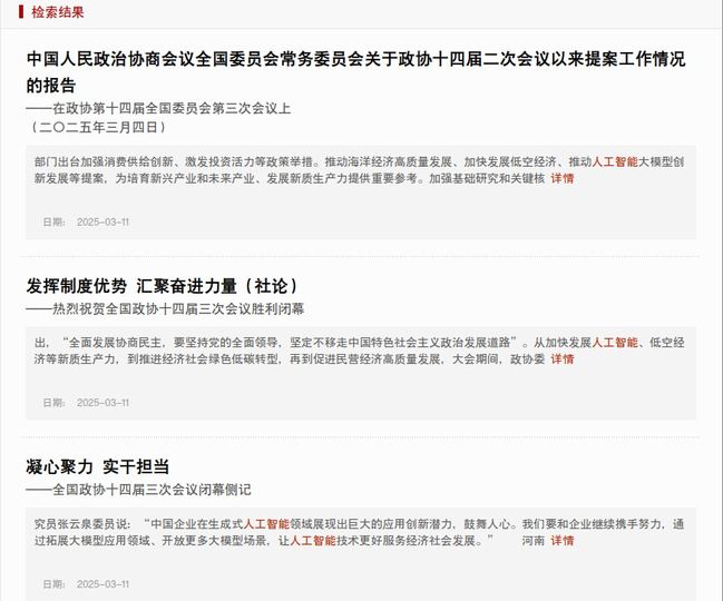 如想了解全国政协十四届三次会议的代表发言和工作报告中涉及人工智能的内容,就可以在正文检索框中输入“人工智能”,并在分类框中选择对应的会议名称,即可检索到所需要的文献内容。