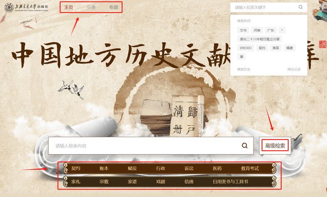 在数据库首页可通过中间或右上角检索框进行全库检索,也可直接通过点击主页左上角“分类”“收藏”或检索框下方各专题子库进行浏览。该库同时支持高级检索。