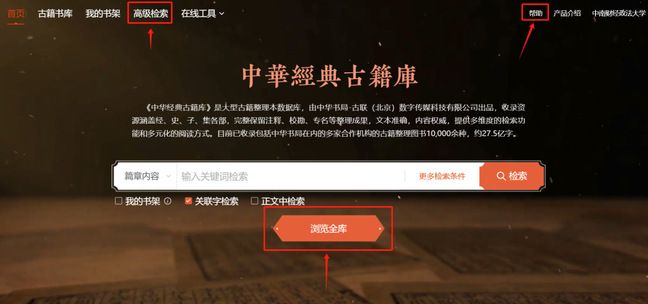 在数据库主页可以通过中间检索框进行全库检索,也可通过“浏览全库”按钮进行资源浏览。主页右上角提供数据库使用“帮助”。
