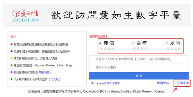 首次使用中国基本古籍库,需要进行个人用户注册。注册完毕后,在数据库首页按需选择登录口,登录后即可进入相应子库。