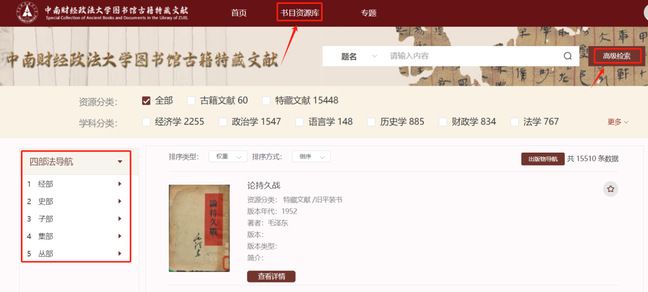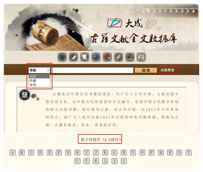 例如:点击进入“古籍文献”子库,该子库支持基本检索和高级检索,同时支持按字母排序进行资源浏览。