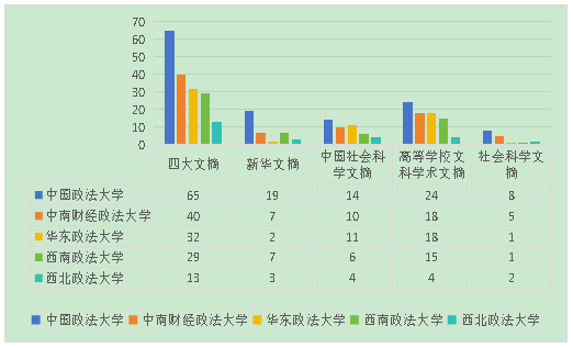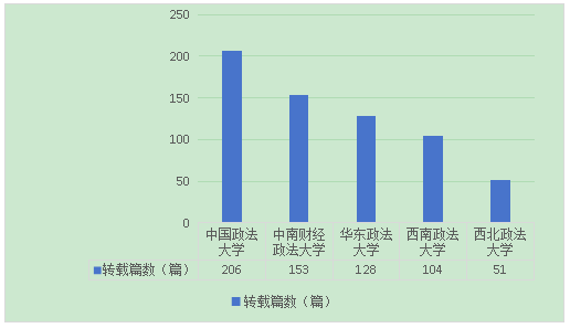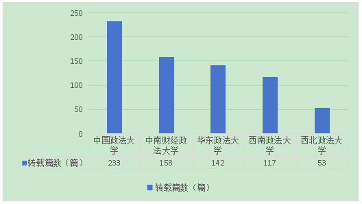 在对不同转载途径进行组配统计中发现,我校学术论文转载量仅次于中国政法大学,位居第二。