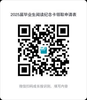 1. 毕业生线上填写《毕业阅读纪念卡领取申请》,详细填写姓名、学院、学号、联系方式等个人信息。扫描下方二维码,或点击链接:https://f.kdocs.cn/g/7gnxb9Q9/,提交申请。