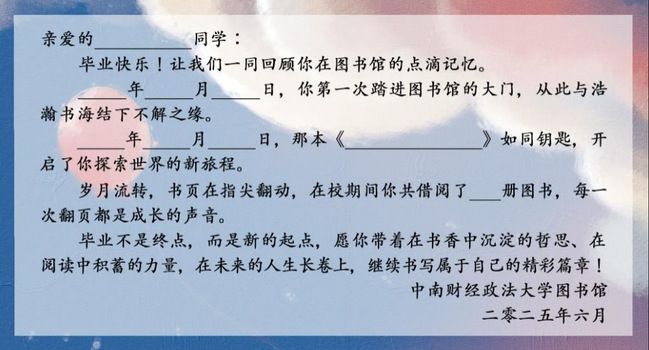 2. 图书馆将根据提交时间选取前50名毕业生,为其制作专属阅读纪念卡一份。