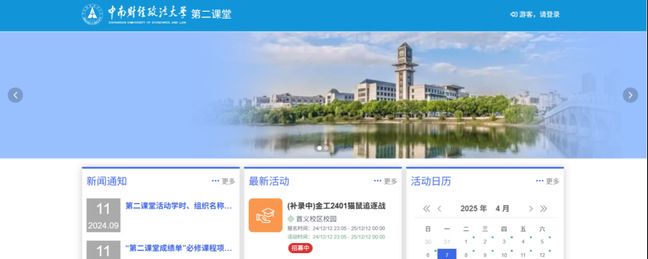 1. 进入第二课堂主页(http://dekt.zuel.edu.cn/dekt/)后,点击右上角“游客,请登录”并完成统一身份认证。