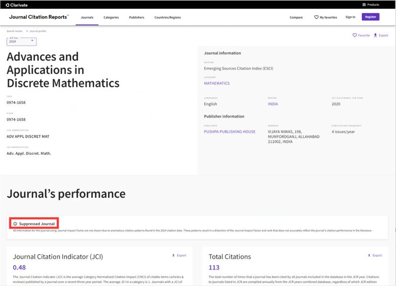 Suppressed Journal(被镇压期刊)在JCR数据库的 journal profile页面会进行标注,如图2所示。