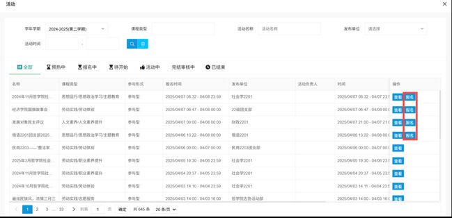 3. 在操作页面中找到本次数据库培训,点击右后方的“报名”,即可报名。