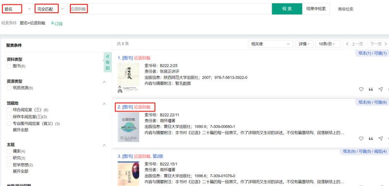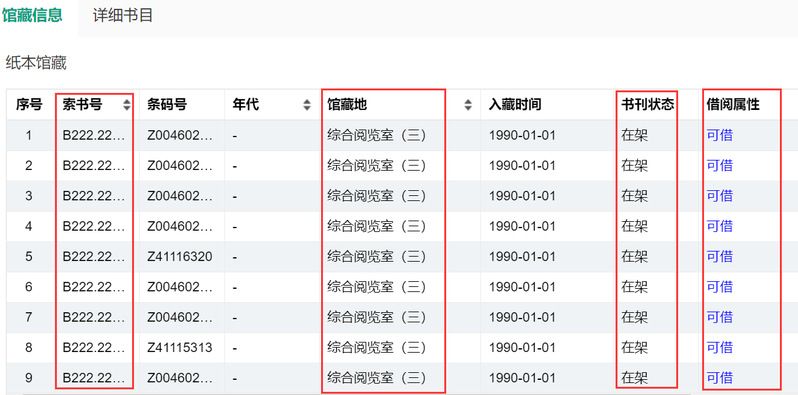 (2)在检索结果页面,点击所需图书书名进入馆藏信息页面,找到“可借”且“在架”的图书,记录下“索书号”及“馆藏地”,到对应阅览室根据索书号即可找到该图书。
