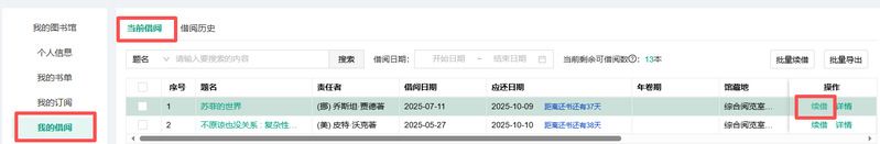 登录“我的图书馆”,进入“我的借阅”界面,即可查看个人纸质图书借阅信息,也可在该界面办理纸质图书续借。“我的图书馆”登录方法如下: