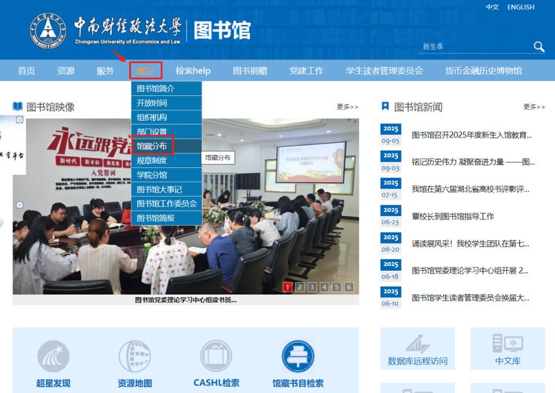 在图书馆主页上方工具栏处,点击“概况”——“馆藏分布”,即可查看南湖校区逸夫图书馆和首义校区图书馆馆藏分布一览表。空间布局轻松get,快来看看你想要的图书在哪里吧!