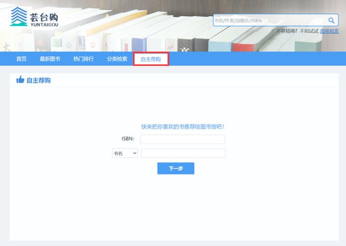 4. 若师生有想荐购图书的精确信息。可点击页面上方“自主荐购”按钮,输入图书的ISBN号或书名等相关信息,完成荐购。