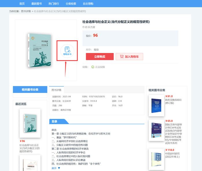 5. 对于有意向荐购的图书,可点击书名进入详情页面,师生可浏览网页下方图书详情了解该书的基本信息,点击页面中间“荐购本书”按钮,即为荐购成功。