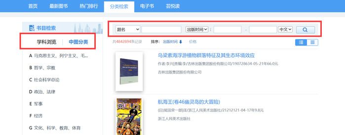 3. 若师生想荐购具体学科分类下的图书,可点击页面上方“分类检索”按钮,在左侧按照学科浏览相应分类下的图书,也可以使用书名或出版时间进行检索,查找感兴趣的图书进行推荐。