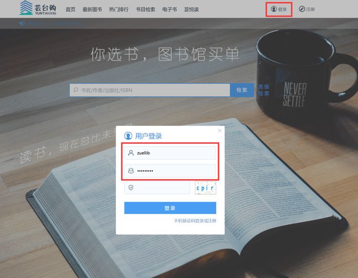 1. 进入“芸台购”平台后,点击网站上方“登录”按钮,输入校图书馆荐书账户。
